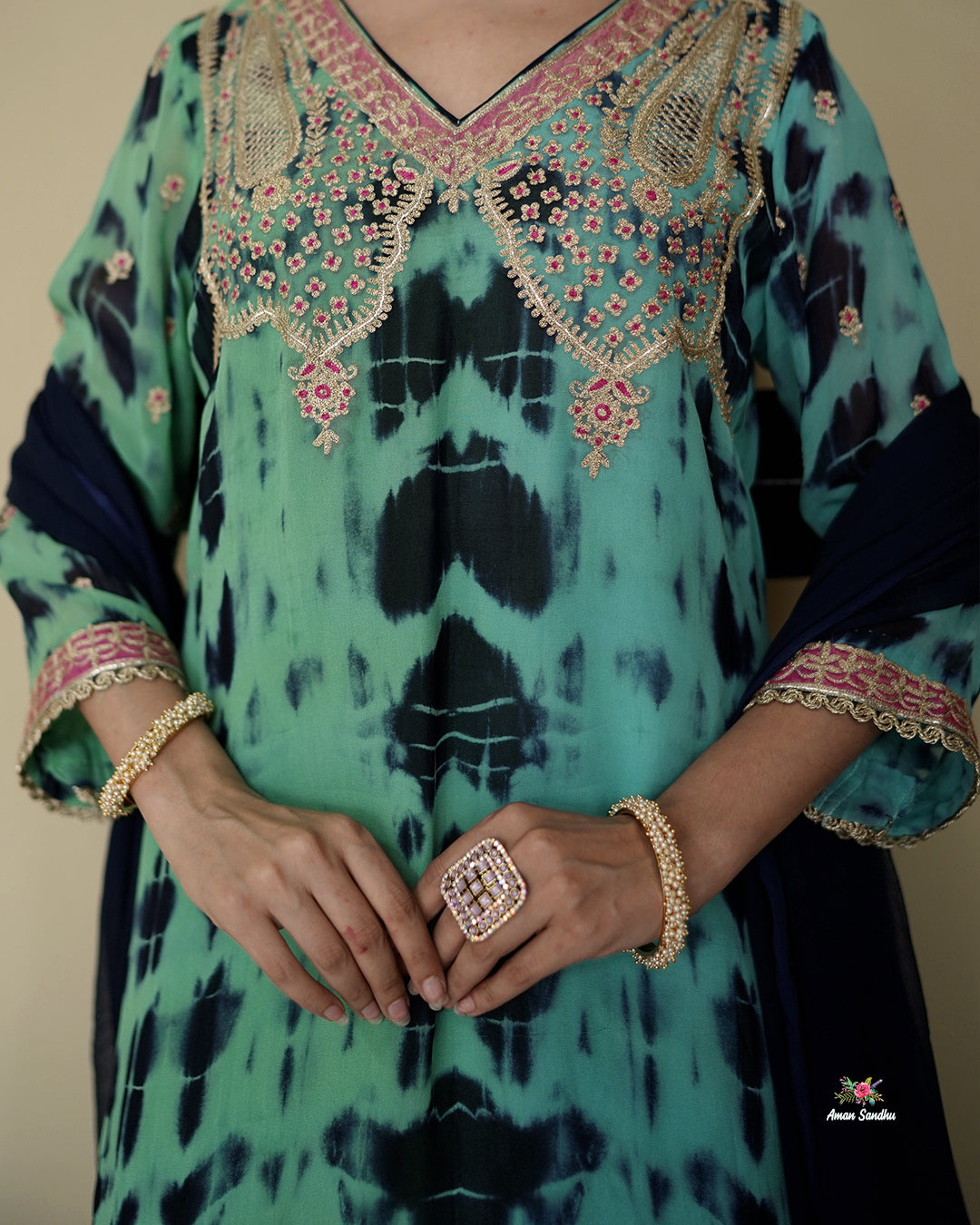 Blue Tie Dye Georgette Chiffon Shirt With Plan Navy Blue Crepe Bottom With Plan Navy Blue Pure Chiffon Dupatta and Machine, Aari, Dori and Patch Work on Shirt and Bottom and Dupatta Finished With Lace Border.